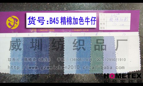 織物組織:平紋 幅寬:150cm 品名:滌棉牛仔 密度:64*47 水洗工藝:砂洗 貨號:B45精棉加色 重量:* 具體用途:休閑服、工作服、褲裝、時裝 別名:B45精棉加色 印染工藝:印花 成分及含量:65%棉,35%滌 主要用途:服裝用布 ======================================================================= 以上產品全部現(xiàn)貨供應,可隨時提供樣布卡和現(xiàn)貨,隨時發(fā)貨。所有產品全部是廠家直銷價,我們承諾:以超低利潤營銷,我 們只求銷售量。為保證您的利益,我司建議您在采購前先確認我們的品質樣與顏色樣后再拿大貨,期待與您的真誠合作。因產 品種類較多,具體參考未盡詳盡,如有需要,請您與我們聯(lián)系。    瑞豐紡織(中大旗艦店)坐落于國內最大的紡織面料產業(yè)中心—廣州中大,是一家專業(yè)銷售面料的廠家直銷商。主要經 營產品有:全棉凈色、仿記憶絲面料、全棉(TC)色織等,面料品種花達上千余種,所有產品全部現(xiàn)貨經營。   我們面料的品質來源于:1、采用國內外優(yōu)質的原材料;2、使用精良的生產工藝和設備;3、完善的生產質量管理體系。我 們具有開發(fā)和創(chuàng)新品種的強烈意識和優(yōu)越條件,并根據(jù)客戶需求與市場變化時時推出潮流面料。憑著多年的專業(yè)行業(yè)經驗,根 據(jù)客戶需求,不論客戶在全國任何地方,只要提供小樣,就可在一兩天時間內輕松獲得所需面料的信息。 批發(fā)說明供應商支持混批 。 ============================================================= 有意請加QQ:1295021910或電話聯(lián)系。 公司名稱:威圳紡織品廠 聯(lián)系人:陳修喜先生 手機:13650817858 網址:http://www.gzweizhen2010.cn.alibaba.com =============================================================