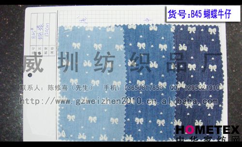 織物組織:平紋 幅寬:150cm 品名:滌棉牛仔 密度:64*47 水洗工藝:砂洗 貨號(hào):B45蝴蝶 重量:* 具體用途:襯衫、休閑服、工作服、褲裝、時(shí)裝 別名:B45蝴蝶 印染工藝:印花 成分及含量:65%棉,35%滌 主要用途:服裝用布 ======================================================================= 以上產(chǎn)品全部現(xiàn)貨供應(yīng),可隨時(shí)提供樣布卡和現(xiàn)貨,隨時(shí)發(fā)貨。所有產(chǎn)品全部是廠家直銷(xiāo)價(jià),我們承諾:以超低利潤(rùn)營(yíng)銷(xiāo),我 們只求銷(xiāo)售量。為保證您的利益,我司建議您在采購(gòu)前先確認(rèn)我們的品質(zhì)樣與顏色樣后再拿大貨,期待與您的真誠(chéng)合作。因產(chǎn) 品種類(lèi)較多,具體參考未盡詳盡,如有需要,請(qǐng)您與我們聯(lián)系。    瑞豐紡織(中大旗艦店)坐落于國(guó)內(nèi)最大的紡織面料產(chǎn)業(yè)中心—廣州中大,是一家專(zhuān)業(yè)銷(xiāo)售面料的廠家直銷(xiāo)商。主要經(jīng) 營(yíng)產(chǎn)品有:全棉凈色、仿記憶絲面料、全棉(TC)色織等,面料品種花達(dá)上千余種,所有產(chǎn)品全部現(xiàn)貨經(jīng)營(yíng)。   我們面料的品質(zhì)來(lái)源于:1、采用國(guó)內(nèi)外優(yōu)質(zhì)的原材料;2、使用精良的生產(chǎn)工藝和設(shè)備;3、完善的生產(chǎn)質(zhì)量管理體系。我 們具有開(kāi)發(fā)和創(chuàng)新品種的強(qiáng)烈意識(shí)和優(yōu)越條件,并根據(jù)客戶需求與市場(chǎng)變化時(shí)時(shí)推出潮流面料。憑著多年的專(zhuān)業(yè)行業(yè)經(jīng)驗(yàn),根 據(jù)客戶需求,不論客戶在全國(guó)任何地方,只要提供小樣,就可在一兩天時(shí)間內(nèi)輕松獲得所需面料的信息。 批發(fā)說(shuō)明供應(yīng)商支持混批 。 ============================================================= 有意請(qǐng)加QQ:1295021910或電話聯(lián)系。 公司名稱(chēng):威圳紡織品廠 聯(lián)系人:陳修喜先生 手機(jī):13650817858 網(wǎng)址:http://www.gzweizhen2010.cn.alibaba.com =============================================================