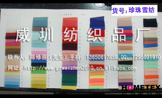 織物組織:平紋 幅寬:150cm 品名:雪紡 密度:121*96 染整工藝:染色 貨號:珍珠雪紡 具體用途:休閑服、時裝、戶外服 別名:珍珠雪紡 成分及含量:100%滌綸 主要用途:服裝用布 紗支:20D+26D*20D+26D ============================================================= 以上產品全部現貨供應,可隨時提供樣布卡和現貨,隨時發貨。所有產品全部是廠家直銷價,我們承諾:以超低利潤營銷,我們只求銷售量。為保證您的利益,我司建議您在采購前先確認我們的品質樣與顏色樣后再拿大貨,期待與您的真誠合作。因產品種類較多,具體參考未盡詳盡,如有需要,請您與我們聯系。    瑞豐紡織(中大旗艦店)坐落于國內最大的紡織面料產業中心—廣州中大,是一家專業銷售面料的廠家直銷商。主要經營產品有:全棉凈色、仿記憶絲面料、全棉(TC)色織等,面料品種花達上千余種,所有產品全部現貨經營。   我們面料的品質來源于:1、采用國內外優質的原材料;2、使用精良的生產工藝和設備;3、完善的生產質量管理體系。我們具有開發和創新品種的強烈意識和優越條件,并根據客戶需求與市場變化時時推出潮流面料。憑著多年的專業行業經驗,根據客戶需求,不論客戶在全國任何地方,只要提供小樣,就可在一兩天時間內輕松獲得所需面料的信息。 批發說明供應商支持混批 。 ============================================================= 有意請加QQ:1295021910或電話聯系。 公司名稱:威圳紡織品廠 聯系人:陳修喜先生 手機:13650817858 網址:http://www.gzweizhen2010.cn.alibaba.com =============================================================