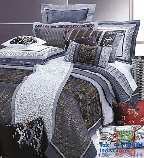 此款設(shè)計(jì)采用、體現(xiàn)了傳統(tǒng)與浪漫、古典與現(xiàn)代相融合的手法與風(fēng)格,緊扣主題。圖案母題選擇了變形的傳統(tǒng)卷草紋樣與中國園林木窗花格,作為主設(shè)計(jì)元素。而靠墊上的長方格及漸變圓點(diǎn)等計(jì)算機(jī)圖形,則突出了現(xiàn)代和時(shí)尚的特點(diǎn),色彩以灰色為主調(diào),妃色、金黃色等作局部對(duì)比,產(chǎn)生了即統(tǒng)一、協(xié)調(diào)又活潑、豐富的藝術(shù)效果。面料采用高檔的提花色織紡織品,一些細(xì)則應(yīng)用先進(jìn)的彈力繡花工藝,更提高了產(chǎn)品的檔次與品位。套件的枕頭、靠墊上有些花形與主圖案的相關(guān)性與系列配套感稍顯不足。
